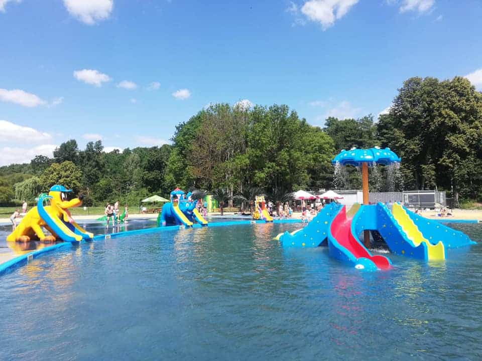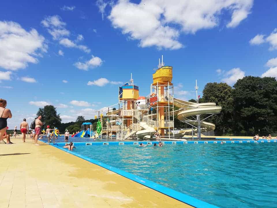 - Water park Zalesie: website in Polish. Opening hours: 10 am – 6 pm (every day). The water park is open from June 26, 2021 until August 31, 2021. Outdoor pools consist of a swimming pool 145 cm deep, a 45 cm deep water play area with a playground consisting of 3 large slides for adults and children over 140 cm. In this zone there is also an octopus slide for smaller children. Little children can play in a spray area with spray fountains.