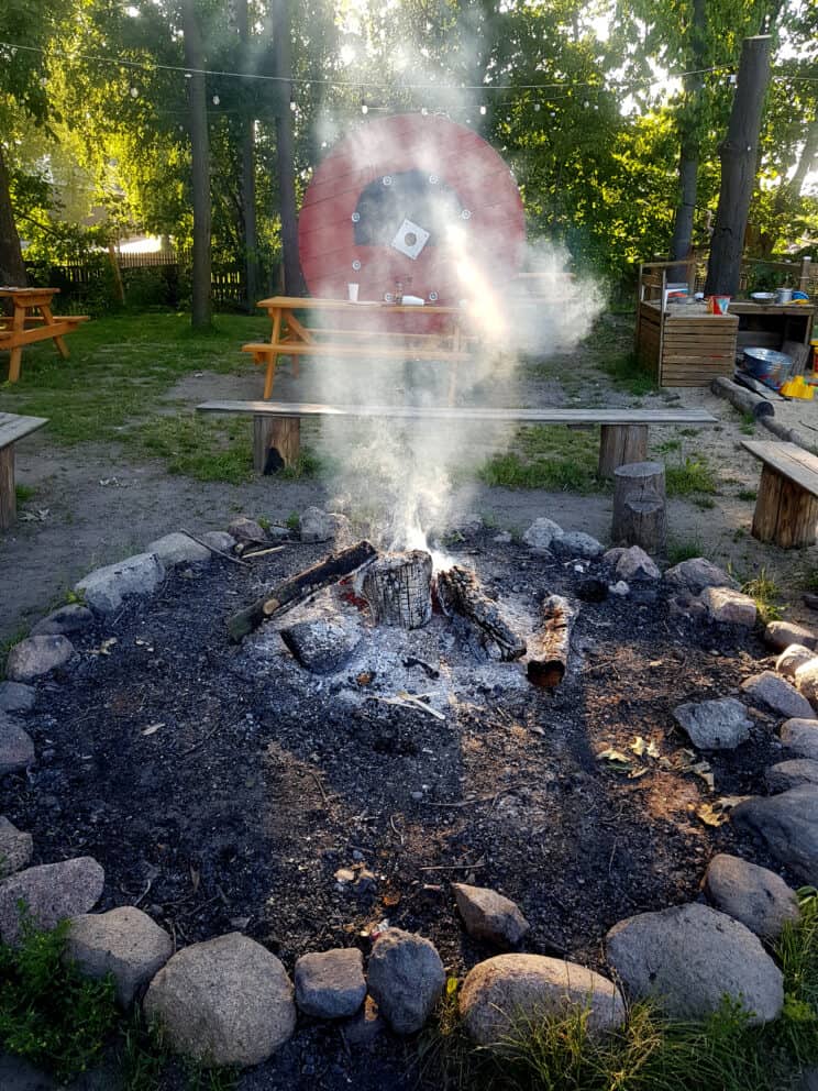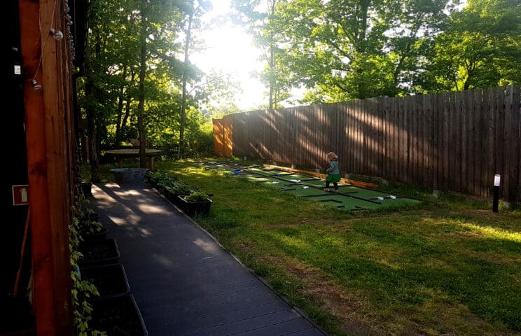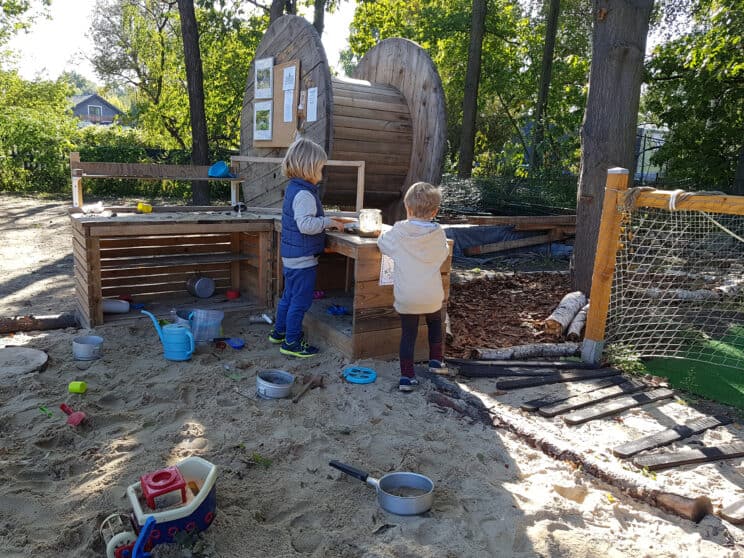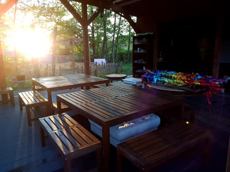 On the premises, you will find a bonfire spot, a basketball ring to throw some hoops, badminton set for a family competition, a mini football-golf area, a slack-line, a small circular maze with big plastic blocks, a beach-like area with umbrellas and wooden tables, a mud kitchen where kids make all kinds of mixtures with nature’s elements (be ready to have a change of clothes at hand – kids tend to get messy and rarely want to leave early). A 3-4 – hour stay is what you should expect.
