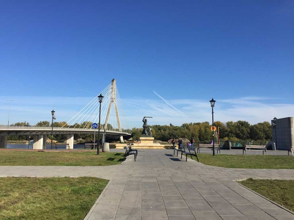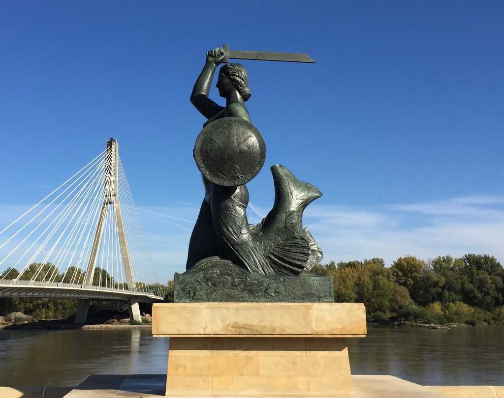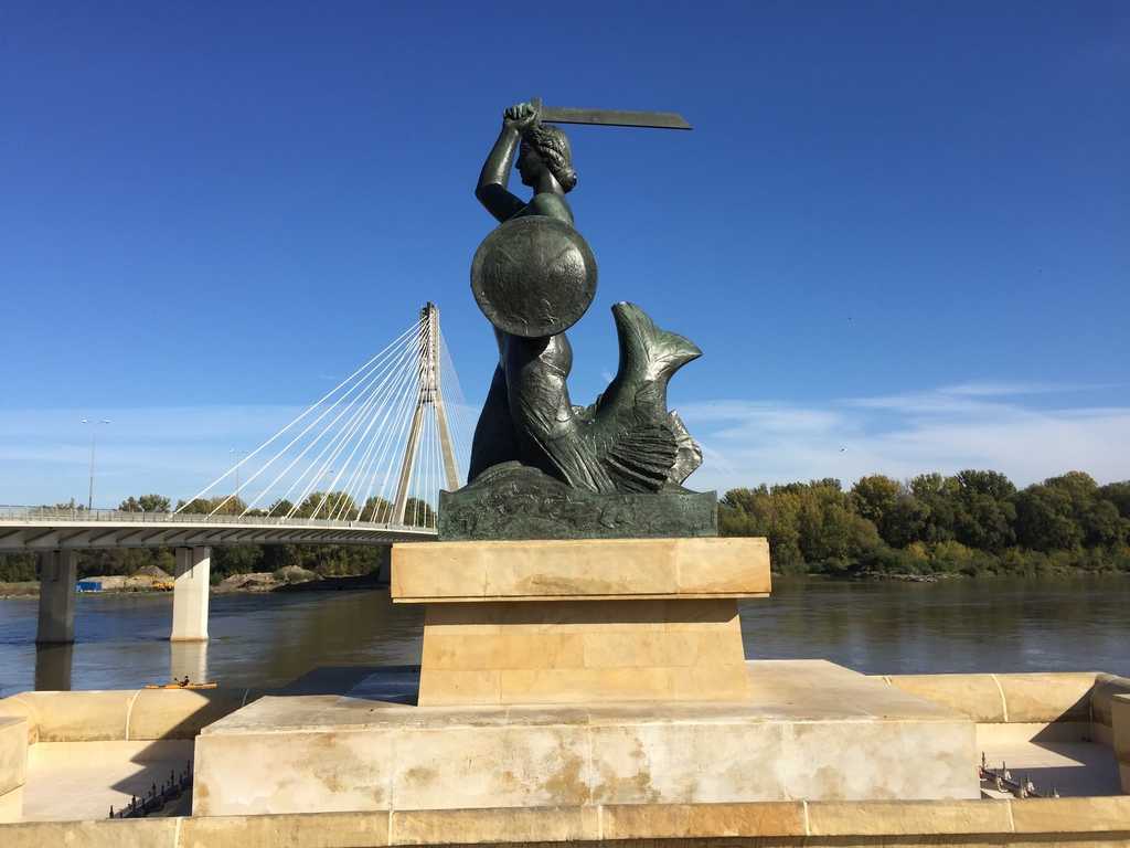 The largest of the Warsaw mermaid statues (build in 1939), located next to the Świętokrzyski Bridge. The Mermaid of Warsaw (Syrena Warszawska) is a symbol of Warsaw. You will find another famous mermaid statue at the Warsaw Old Town Square.