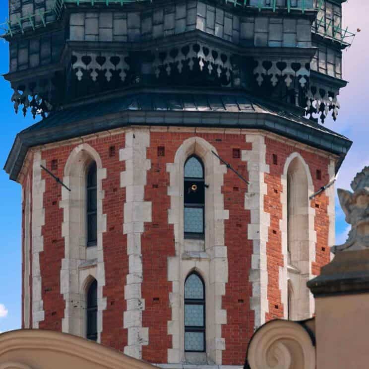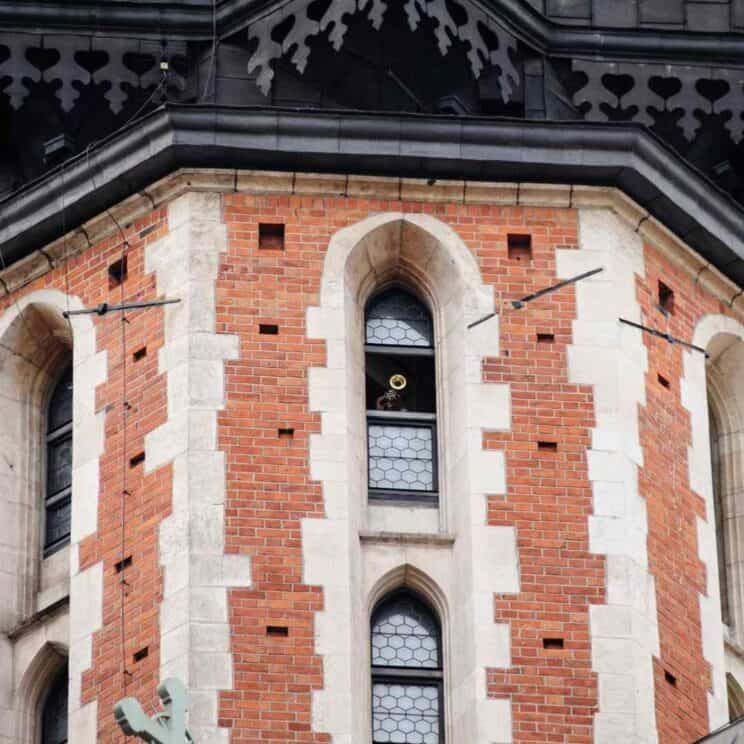 It is worth taking a closer look at the taller tower of the church’s two towers, topped with a late gothic golden crown. It is said to be the only tower in the world from which the bugle call (in Polish: hejnał) has been sounding every hour for over 600 years! The bugle call is played every hour, in the direction of the four corners of the world, by a trumpeter – a fire brigade officer. Don’t be surprised when you hear that the bugle call melody suddenly stops… Legend has it that when in 1241 a foreign army approached Krakow, the guard on the tower started to sound the alarm. He managed to warn the city from attack, but an enemy arrow shot through him in half-time. This is why the bugle-call melody ends so suddenly – at the same moment that the guard stopped playing it in 1241.
