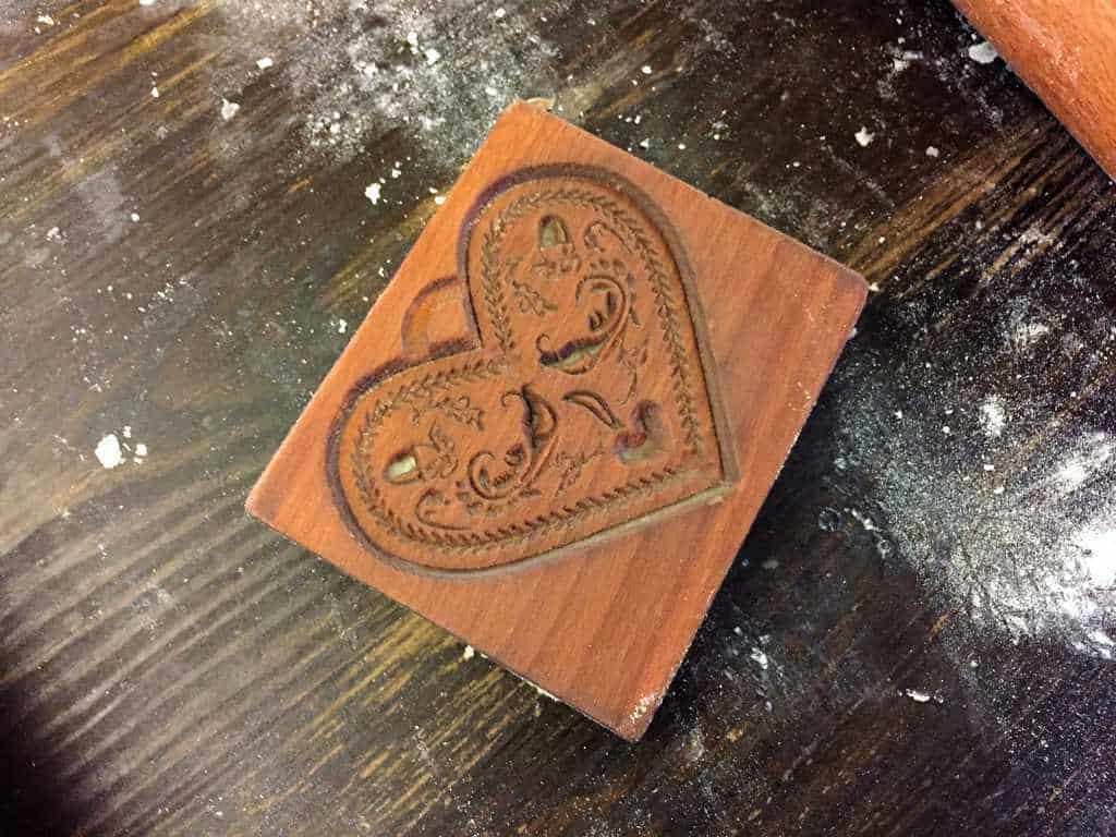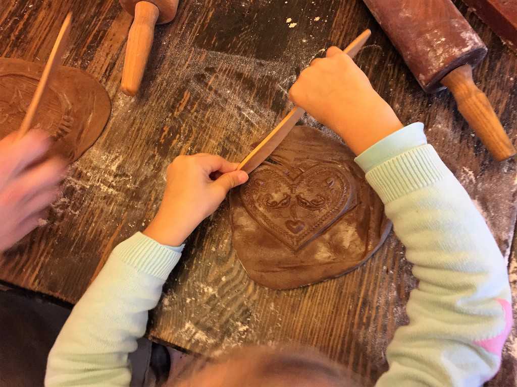 2. Preparing the dough and then baking it (Each visitor gets a piece of raw dough, rolling pin, traditional wooden molds and prepares his/her own gingerbread that is taken to stove.)