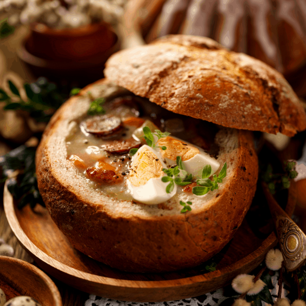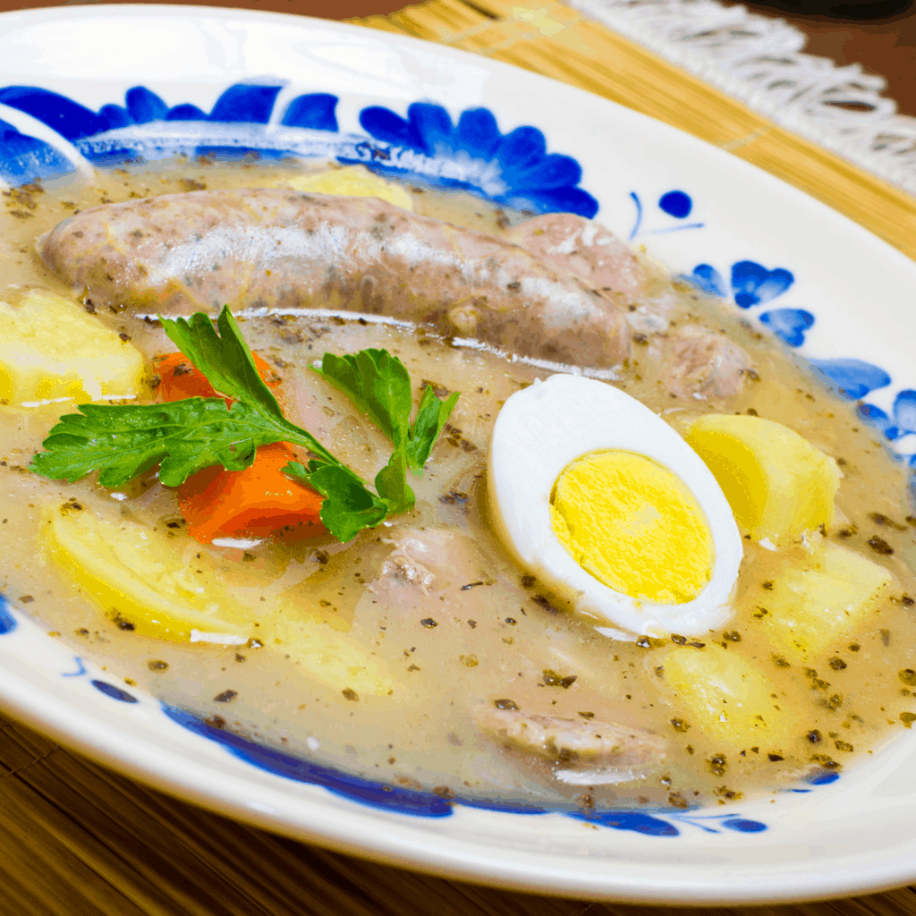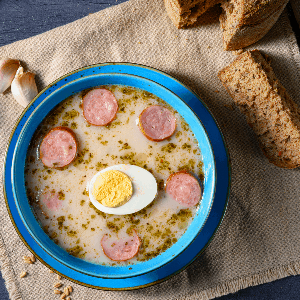 pączek – donut pączki – donuts pączek z lukrem – donut with icing pączek z pudrem – donut with powder nadzienie – filling Poproszę dziesięć pączków. – Ten donuts, please. Winter is the time in Poland when there are no fresh vegetables and when you need to eat warming dishes – the answer to this is żurek soup. This rich soup is made of zakwas (fermented flour starter which was once a by-product of bread baking) and is typically served with boiled eggs and sausage. Żurek is one of the oldest Polish soups. In its original version, it was known as white borscht (barszcz biały) and was eaten mainly by people in the countryside. Żurek soup is cooked a bit differently depending on the region of Poland. Some people add sausage, smoked ribs, smoked bacon, dried forest mushrooms, horseradish, smoked sheep cheese, potatoes, garlic. Traditionally, żurek has been eaten during Easter but now it’s found on menus all year-round. You can order a fancy żurek at the restaurants serving Polish food but you can also easily and quickly prepare it at home! Smacznego!