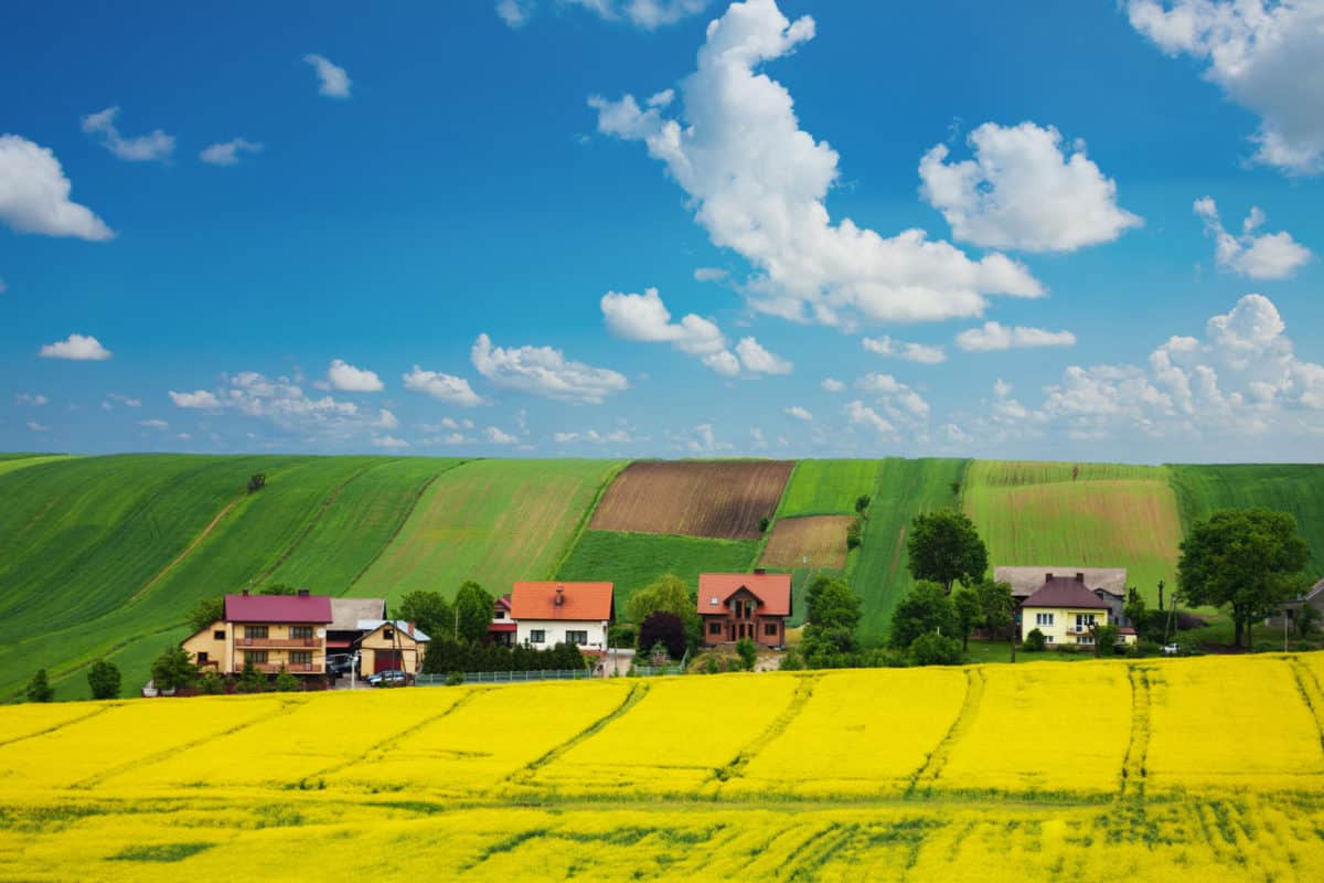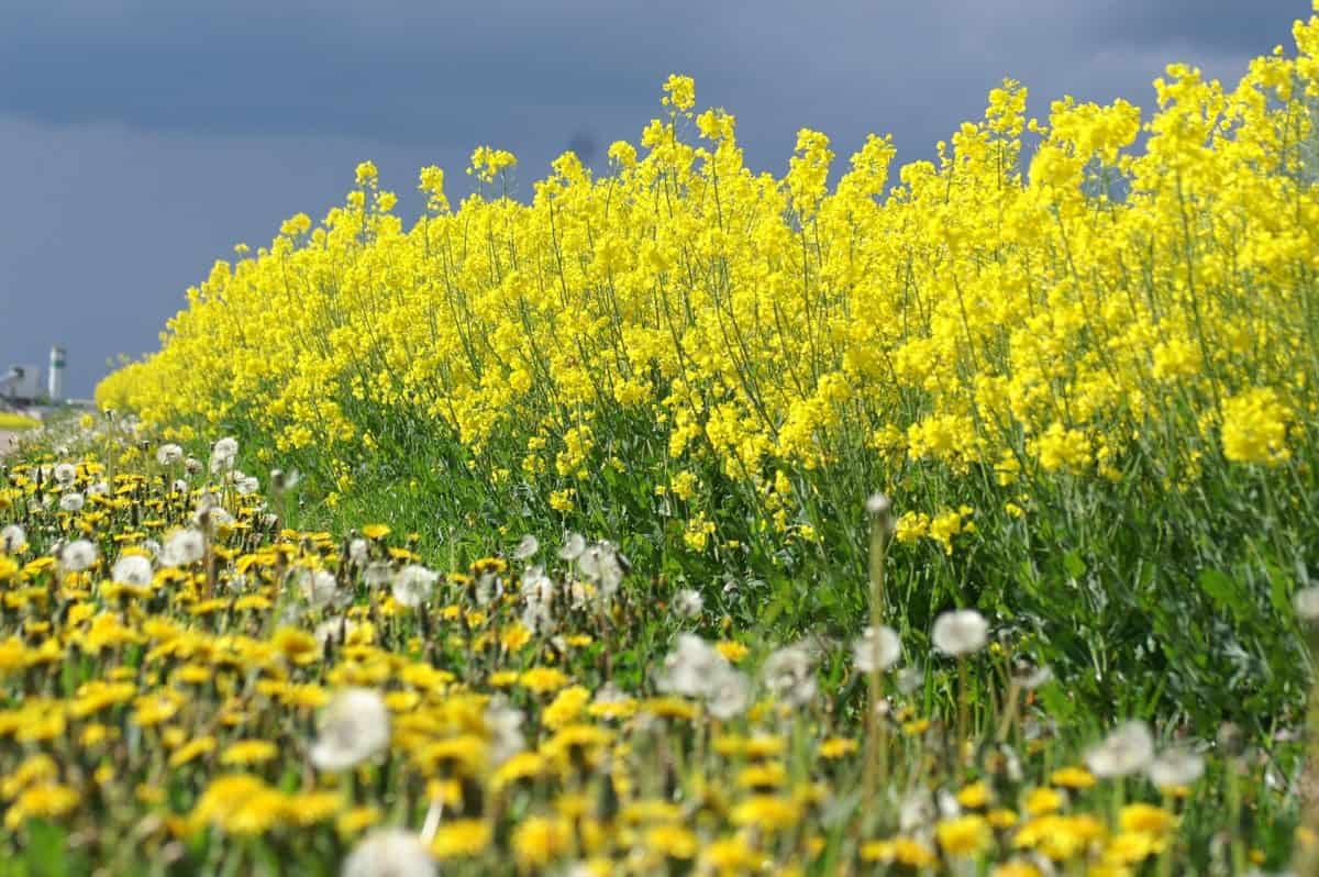 A typical Polish countryside landscape at the end of May and in June – vast yellow fields of blooming rapeseed (rzepak). Rapeseed oil (olej rzepakowy) and rapeseed honey (miód rzepakowy) are very popular in Poland. Canola oil is used for frying and salads. Canola honey (miód rzepakowy) – due to large rapeseed cultivation in Poland – is one of the cheapest kinds of honey. It has a very light straw color and almost white after crystallization.
