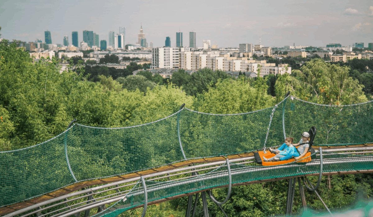 Location: Górka Szczęśliwicka, Park Szczęśliwicki, Drawska 22 Street (Ochota). In the center of the Szczęśliwicki Park in Ochota, there is the highest hill in Warsaw, a 152 m slope called Górka Szczęśliwicka. Since April 24, 2021 on Górka Szczęśliwicka, you can use “Alpine Coaster” (gravity slide / zjeżdżalnia grawitacyjna / kolejka górska). Opening hours Monday – Friday: 1 pm – 8 pm. Opening hours Saturday – Sunday: 10 am – 8 pm. Price for 1 ride for 1 person: 8 PLN (info about tickets). (Website and Facebook page in Polish.