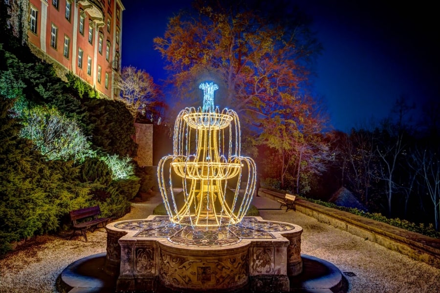 Książ Castle – located in western Poland – rises picturesquely on rocks among forests, in the heart of the Landscape Park. It’s a huge building – it is estimated that it is the third-largest castle in Poland after the Malbork castle and the Wawel castle in Kraków. During the wintertime, the castle garden is enriched with illuminations and festive decorations.